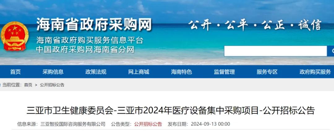 近日,海南省政府采购网发布了《三亚市2024年医疗设备集中采购项目公开招标公告》,标志着该市2024年医疗设备集中采购项目正式拉开帷幕。